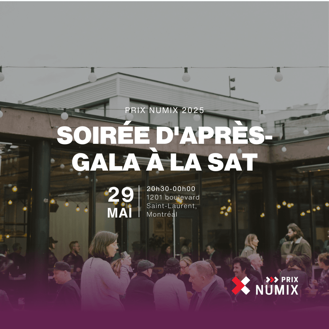 Cette année 2025, les PRIX NUMIX organisent une soirée d’après-gala à la Société des arts technologiques (SAT). Un moment unique pour célébrer et connecter avec les talents de l’industrie d’ici et d’ailleurs.